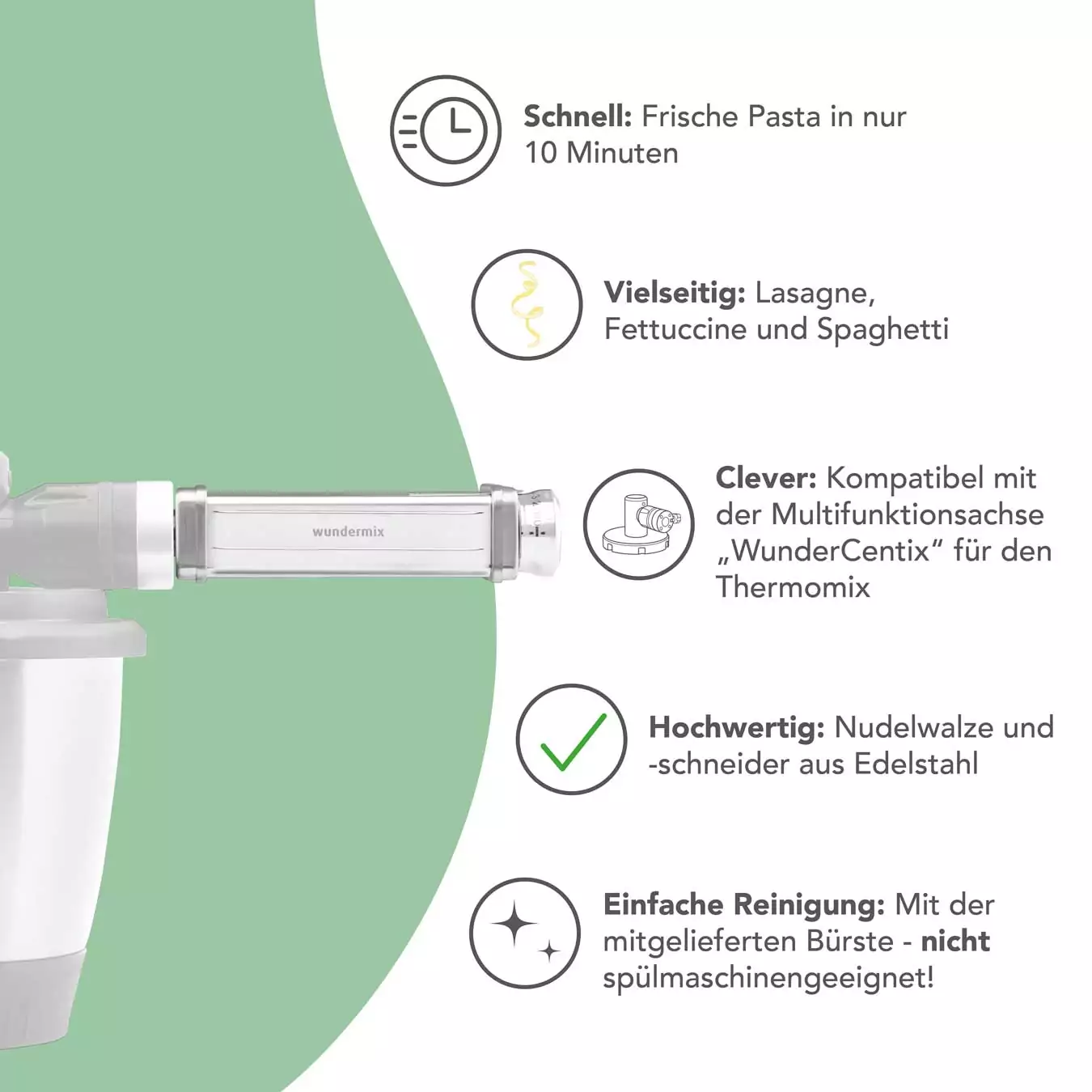Mit dem dreiteiligen Nudelaufsatz für WunderCentix wird Deine Küche zur ultimativen Pasta-Manufaktur! Genieße die Freiheit, frische Pasta genau nach Deinem Geschmack zu kreieren. Ob hauchdünne Lasagneblätter, aromatische Fettuccine oder perfekte Spaghetti – mit diesem hochwertigen Set aus Edelstahl wird Pasta machen zum Kinderspiel.