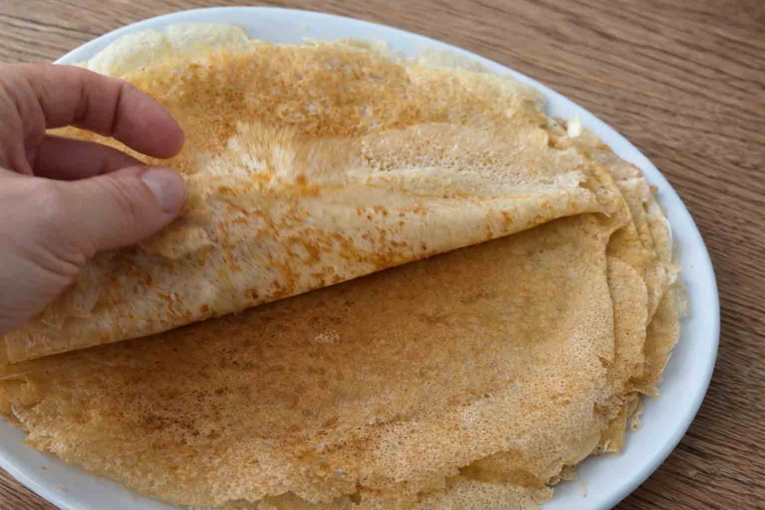 - Eine kleine Schöpfkelle Teig in die Pfanne geben, Pfanne schwenken und Pfannkuchen von beiden Seiten backen, bis sie goldgelb sind.
