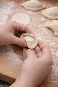 - Teig auf einer bemehlten Fläche dünn (ca. 3 mm) ausrollen und Kreise ausstechen. Jeweils ca. 1 TL Füllung in die Mitte geben, zusammenklappen und die Ränder gut zusammendrücken.
